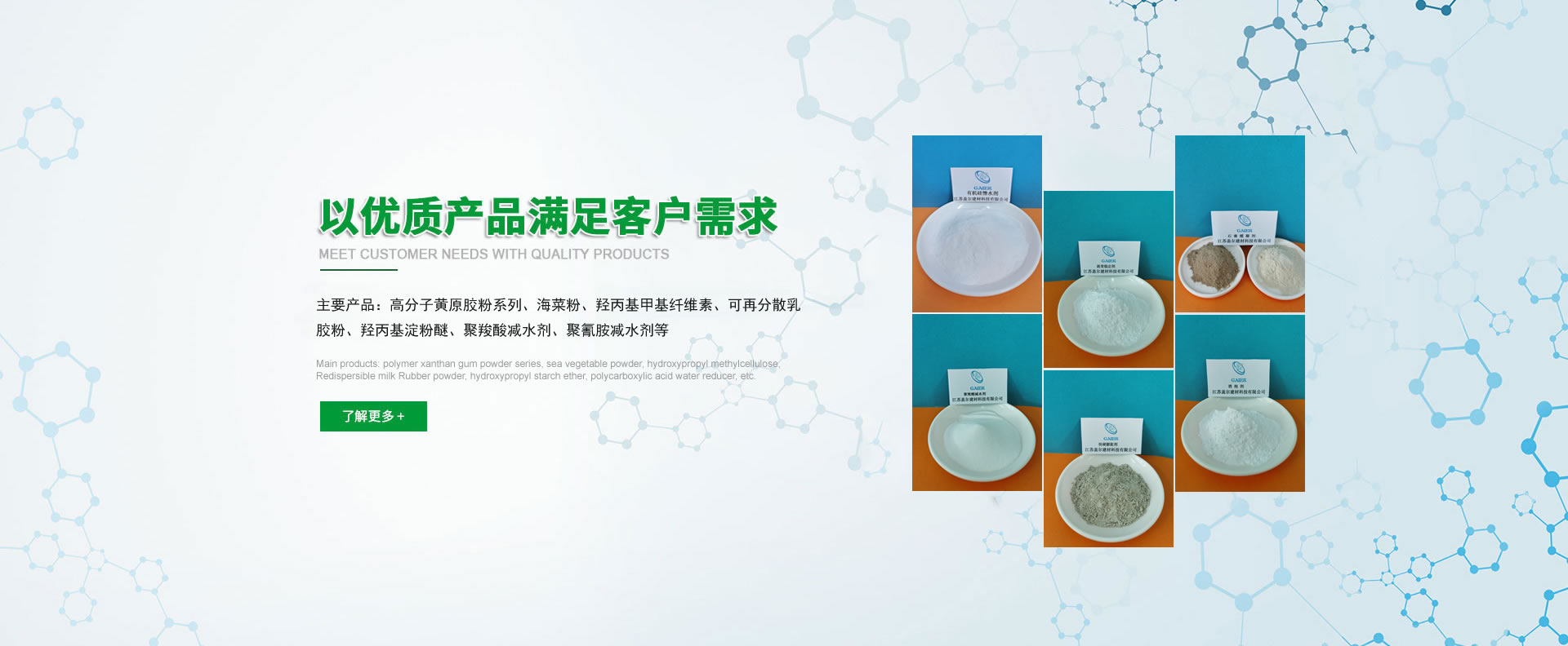 2008年高分子黃原膠粉自主研發成功,相繼研發銷售產品有:流變穩定劑、粉末消泡劑、有機硅憎水劑、憎水乳膠粉、滲透結晶活性母料、粉末聚乙烯醇、塑滑劑、高分子潤滑劑、改性觸變劑、聚羧酸減水劑、三聚氰胺減水劑、快硬膨脹劑、塑性膨脹劑、水泥基緩凝劑、鋰基促凝劑、石膏緩凝劑、返稠抑制劑、可再分散乳膠粉、400粘度纖維素醚、2-20萬粘度纖維素醚、膩子改性纖維素、預拌砂漿改性纖維素、輕質抹灰改性纖維素、石膏砂漿專用纖維素、輕質抹灰專用膠粉、石膏基自流平母料、水泥基石膏基輕質/隔音墊層自流平母料,水泥自流平母料、道路快速修補母料、灌漿料母料、壓漿料母料、水下不分散砂漿母料、EPS線條抹面砂漿母料、輕骨料砂漿專用膠粉、海菜粉、速溶型增稠劑粉末、羥丙基淀粉醚、混凝土早強劑、聚丙烯抗裂纖維、木質纖維等功能型母料助劑。